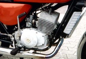 Im Gegensatz zur KS 50 watercooled von 1972 mit ihrer Thermosyphon-Kühlung wälzte nun eine mechanische Pumpe den Kühlmittelvorrat um. Den Primärantrieb, der auch noch die Mikuni-Ölpumpe in Schwung hielt, übernahmen schrägverzahnte Stirnräder; das Getriebe basierte auf der Schaltbox der Moto-Cross-Studie von 1974. Und das bedeutete: Klauenschaltung mit sechs Gängen, als Schluss mit langen Schaltwegen und fehlenden Anschlüssen! Pflegeleicht gaben sich die gekapselte Hinterradkette und die Getrenntschmierung mit Öltank unter der klappbaren Sitzbank.