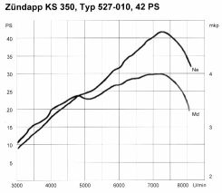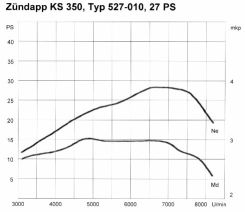 Mittlerweile war es Frühjahr 1976 geworden, und die Zeit drängte. Schließlich sollte auf der IFMA im Herbst ein präsentations- und fahrfertiger Prototyp stehen, daneben sollte noch eine zweite Maschine für den Fahrbetrieb aufgebaut werden. Von einer 250er war nun nicht mehr die Rede, Zündapp konzentrierte sich aus Kostengründen ausschließlich auf die 350er. Ohne direktes Vorgängermodell, an dem man sich hätte orientieren können, entstand ein sehr modernes Motorrad, das es zumindest technisch jederzeit mit der starken japanischen Konkurrenz es hätte aufnehmen können. Herzstück der KS 350 war ein schlitzgesteuerter Zweizylinder-Zweitaktmotor mit horizontal geteiltem Gehäuse - schon das der erste Bruch mit allen Traditionen des Hauses. Die beiden Mahle-Kolben wuchteten ihre Kraft auf eine vierfach gelagerte Kurbelwelle. Mit einem 28er Mikuni-Vergaser ergaben sich 27 PS bei 6800 U/min, die leistungsstärkere Doppelvergaservariante lieferte 40 PS bei 7300 U/min.